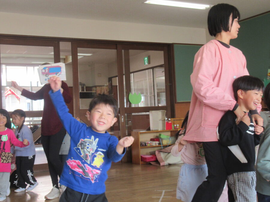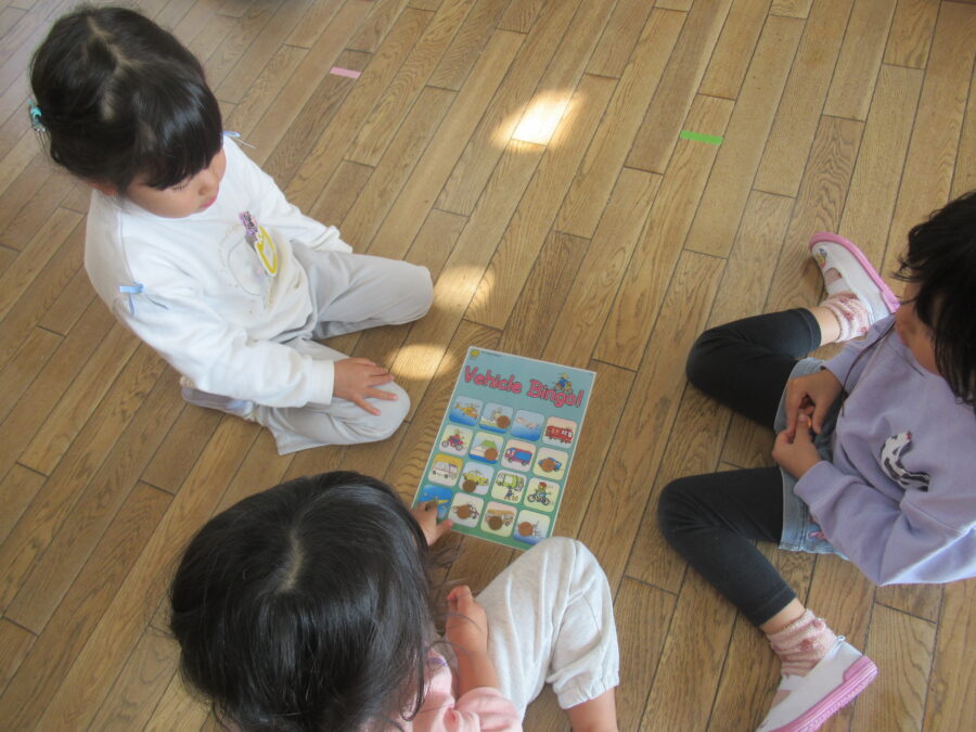 今回は乗り物をテーマにした活動をしました。子どもたちはカードを見ながら、カヤックを漕ぐ動きを考えてみたり、トラックの運転手になりきってハンドルを右に左に動かしたりして、元気いっぱい身体表現を楽しみました。活動の最後には、乗り物ビンゴを行いました。子どもたちはグループで協力しながら、お友だちと一緒に考えたり、声をかけ合ったりして、楽しみました。