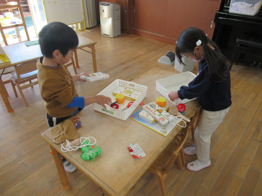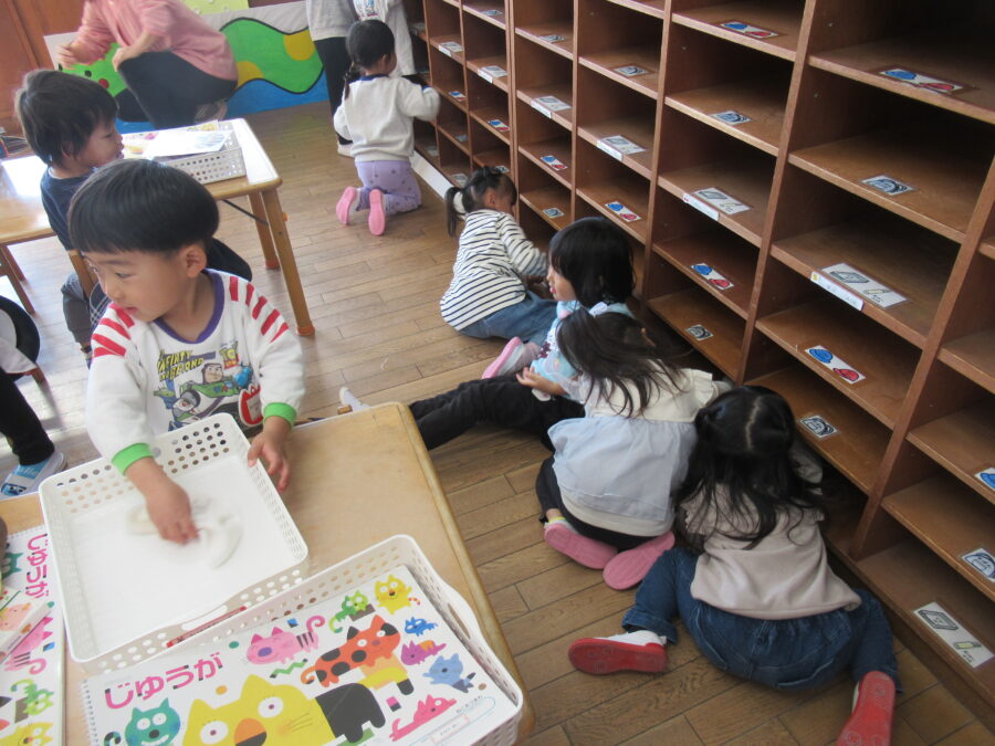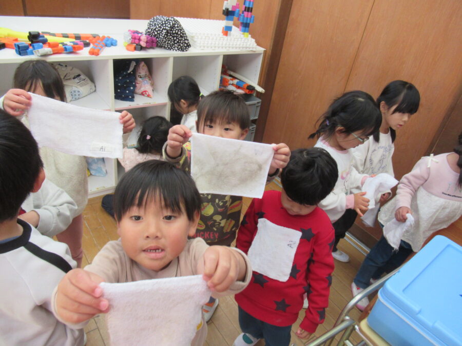 年少・年中・年長の全クラスで大掃除を行いました!普段遊んでいるおもちゃやロッカー、着替え棚、お道具箱など、みんなで雑巾で丁寧に拭き掃除をしました。どの学年もお道具箱やおもちゃをじっくり丁寧に拭き、ロッカーや着替え棚、普段からよく使う場所もしっかりとお掃除しました。雑巾がどんどん黒くなっていくのを見て、「こんなに汚れてたんだね!」と驚いている子もいました。「ピカピカになったよ!」と笑顔で見せてくれる姿がたくさんあり、みんなで力を合わせてお部屋をきれいにする楽しさや達成感を味わうことができました。みんなのおかげで、これからも気持ちよく遊べるお部屋になりました。