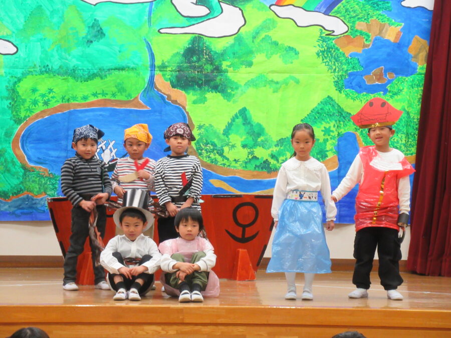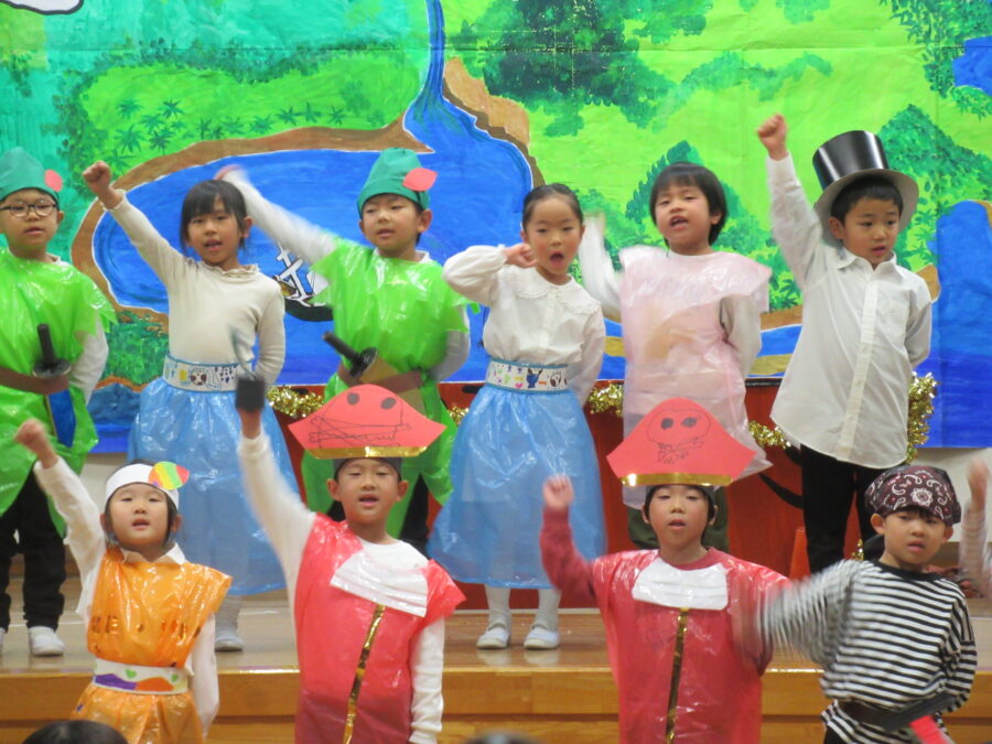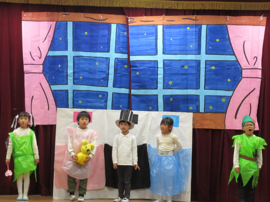 年長児つきぐみのみんなが劇あそび『ピーターパン』を発表しました!ネバーランドを舞台に、ピーターパンやティンカーベル、海賊フック船長、ウェンディたちが、楽しく、勇気いっぱいに大冒険を繰り広げました。はじめは「ドキドキする!」という声もありましたが、練習を重ねるごとに役になりきって演じる姿がどんどん輝いていきました。ティンカーベルのキラキラした動きや、ピーターパンの元気なセリフ、そして仲間を助け合うシーンでは、観ているみんなの心もひとつになりました。子どもたちにとって、この発表会は自信や仲間との絆を深める大切な経験になりました。これからも、一人ひとりの成長を大切にしていきます。