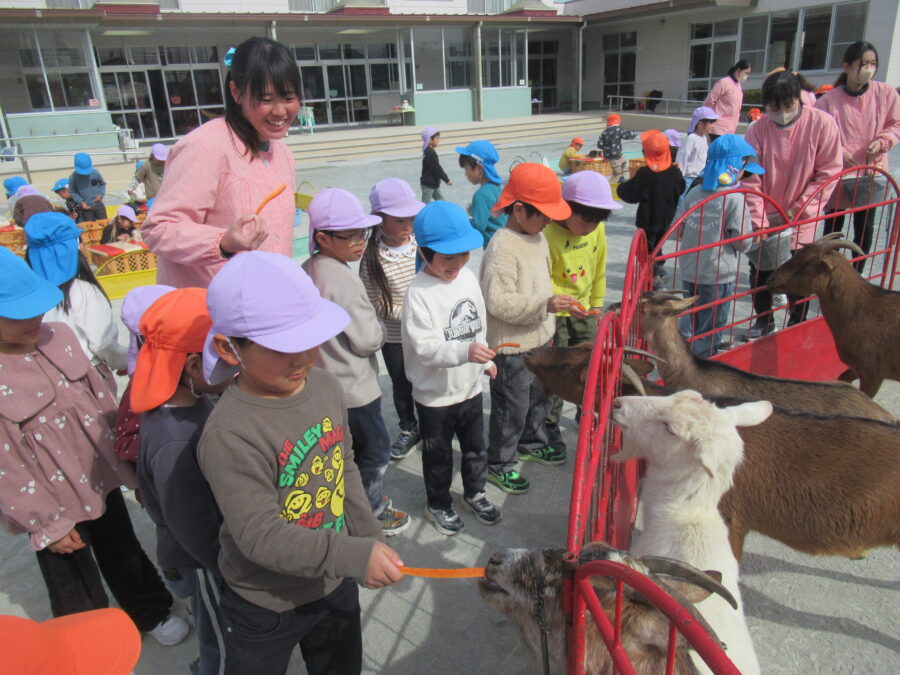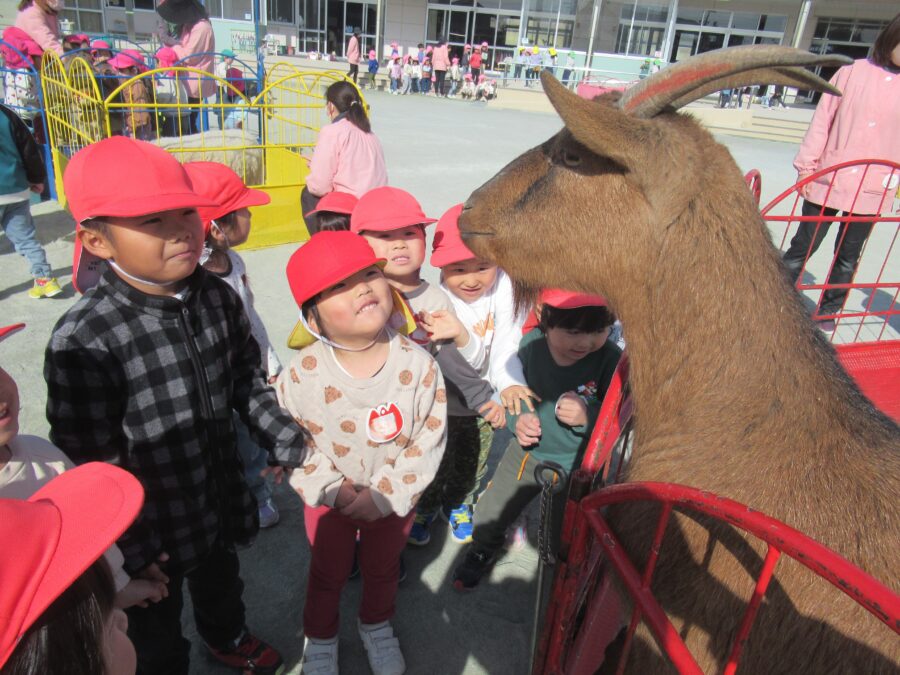 いちご動物園が幼稚園に来てくれました。モルモットやカメ、ヤギ、ヒツジ、ロバ、ウサギ、犬など、たくさんの動物たちが登場!子どもたちは、そっと触れたり、優しく抱っこしたり、餌をあげたりしながら、動物とのふれあいを楽しみました。「モルモット抱っこしたい!」「ヒツジの毛の中に手を入れたらあたたかかったよ」感じたことを目を輝かせながらたくさん話す姿がとても印象的でした。