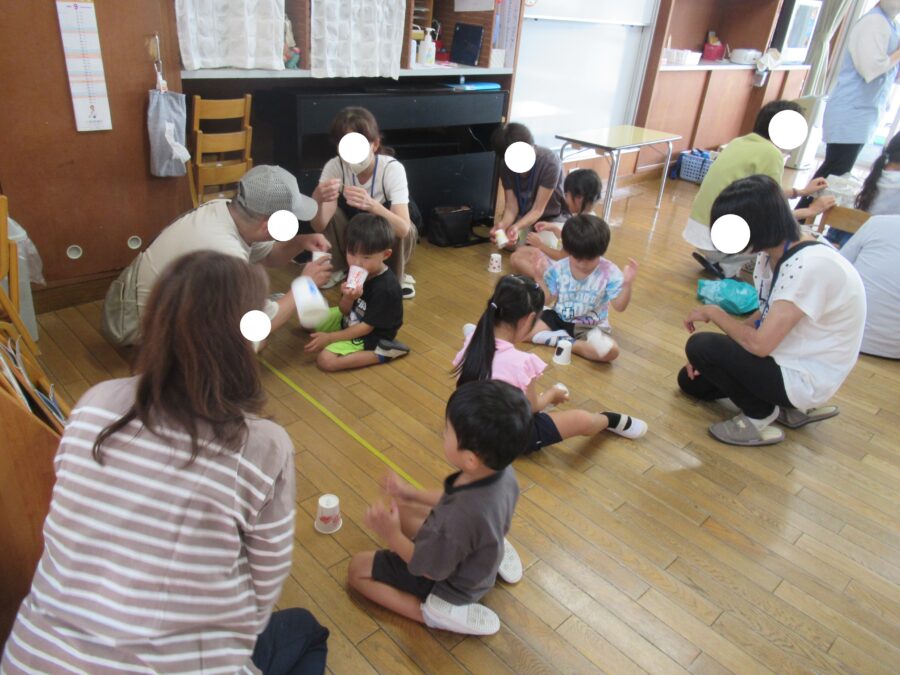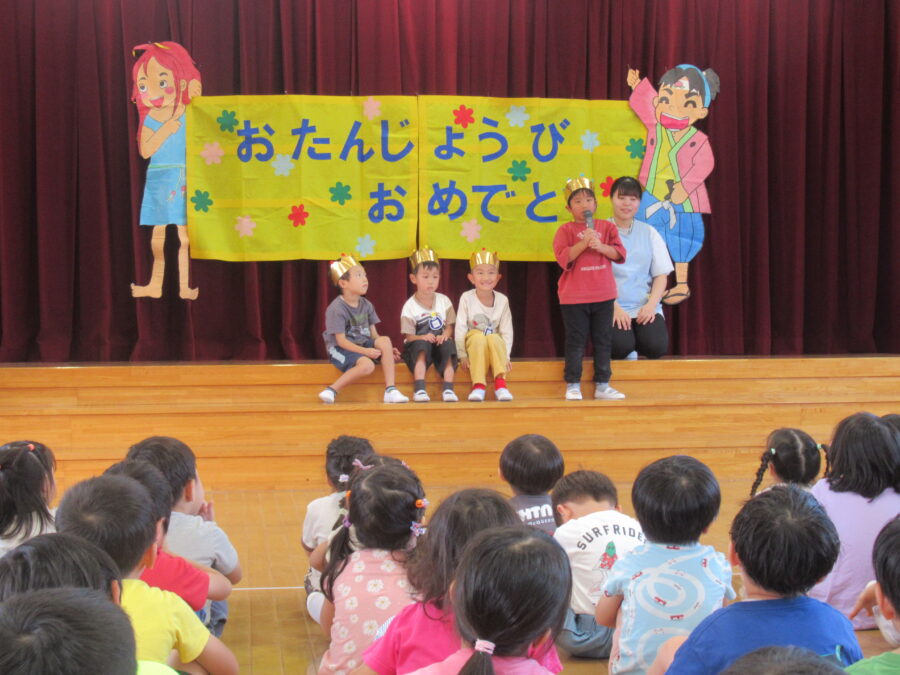 8月の誕生会では、多くの誕生児をお祝いしました。長時間にわたる会となりましたが、誕生児へのインタビューや、みんなで「お誕生日の歌」を歌い、最後まで楽しく参加しました。先生たちによる劇「おおかみと七匹の子ヤギ」もあり、子どもたちは興味津々で観劇し、盛り上がりました。年少児はお部屋でお祝いをし、楽しい時間を過ごしました。