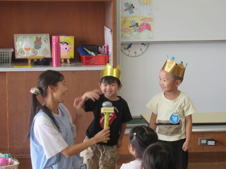 9月生まれのお友だちをお祝いする「お誕生日会」をみんなで楽しく行いました。年長児の発表では、クラス・名前・何歳になったか、そして「大きくなったらなりたいもの」まで、はきはきとしっかり答える姿が見られました。職員劇では「こびとのくつや」を披露し、子どもたちは笑顔いっぱい、劇の中の動きや掛け合いを楽しんでいました。年少児は、お部屋でお祝いをしました。ニコニコの表情で発表する姿がとても可愛らしく、「おおきくなったら〇〇になりたい!」と元気いっぱい伝えてくれました。
