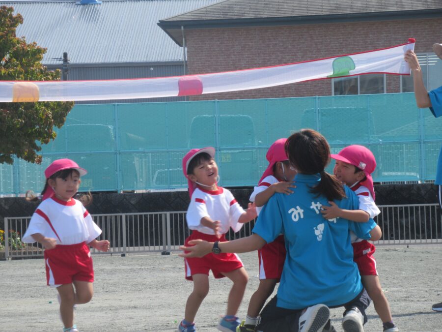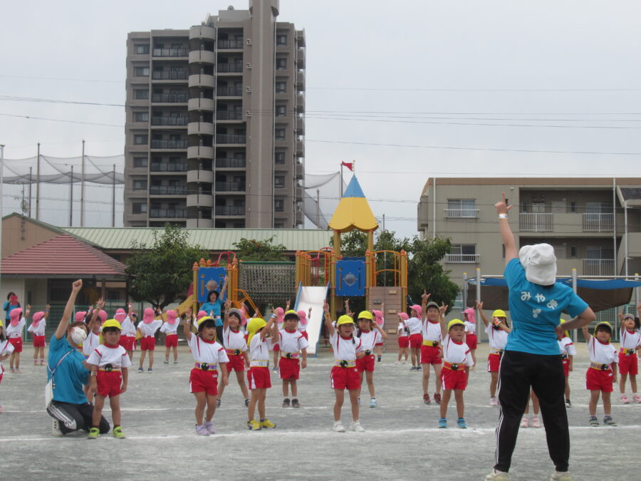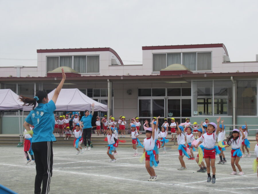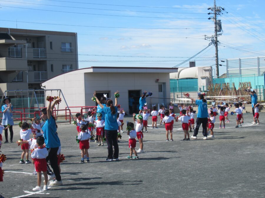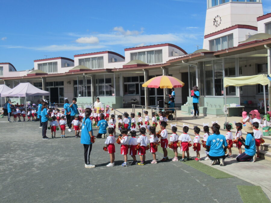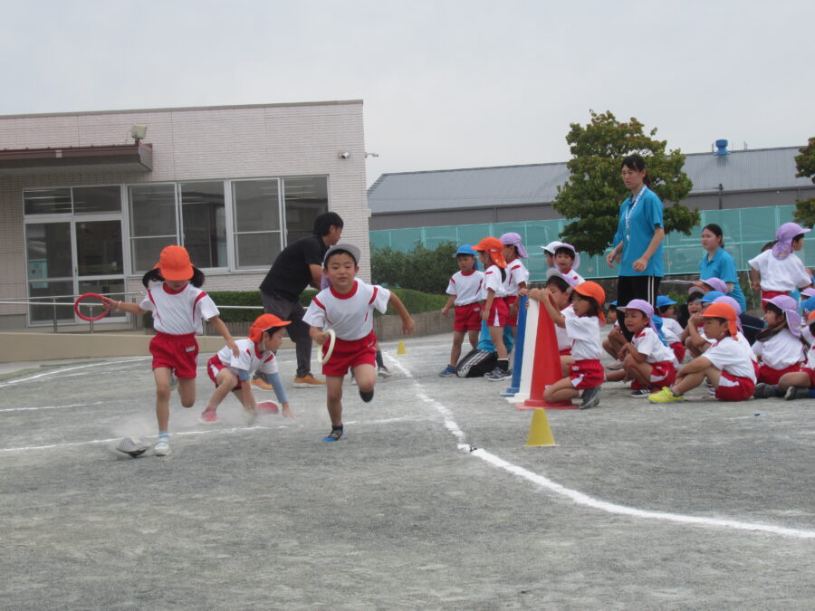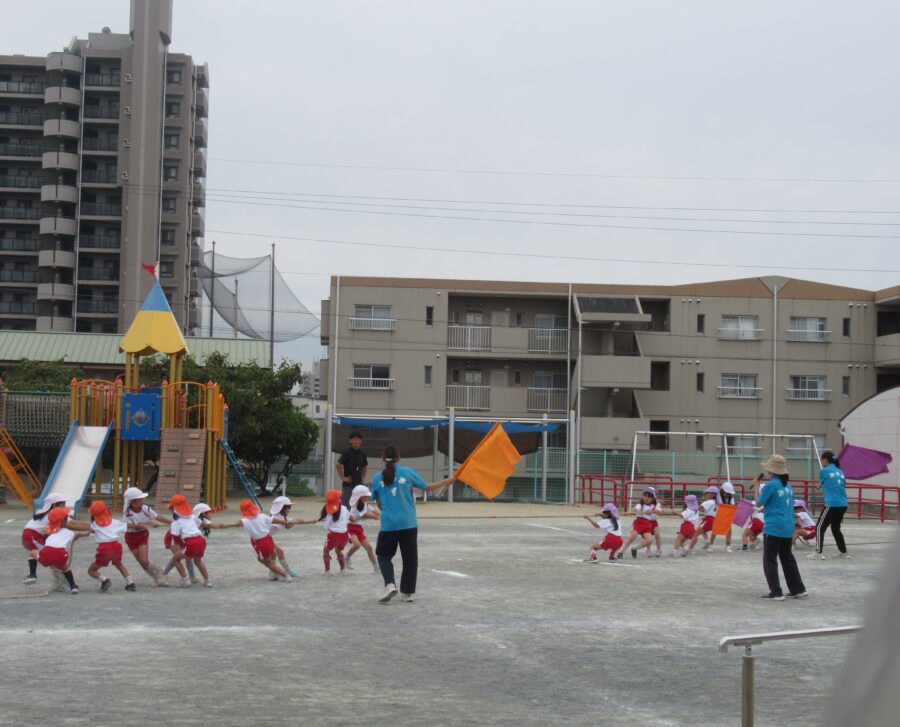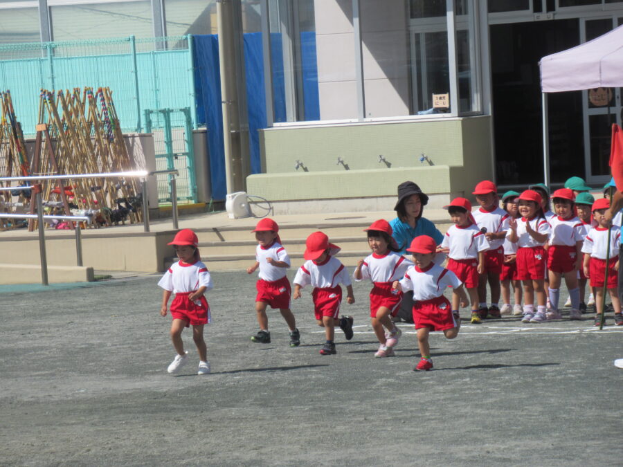 年少児は、初めての運動会予行練習に参加しました。お兄さん・お姉さんたちに応援されながら、一生懸命走ったり、踊ったりする姿がとても可愛らしかったです。本番はたくさんのお客さまに見ていただく予定ですが、どうか「いつも通りのにこにこ笑顔」で、楽しんでほしいと思います。