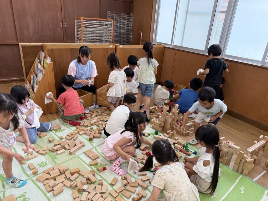 年長児のみんなが、大掃除に取り組みました。まずは積み木を一つひとつ丁寧に拭いて、自分たちの遊んだ道具に「ありがとう」の気持ちを込めました。「みんなでやるとたのしいね」と、子どもたちの意欲もいっぱいでした。その後、ままごとコーナーやロッカー、お道具箱など、普段よく使う場所をみんなで協力してきれいにしました。足元や小さな隙間にも気を配って、みるみる場所がピカピカに変わっていくのが嬉しかったです。こうして、みんなで場を整えることで、気持ちよく夏休みを迎えられる準備ができました。