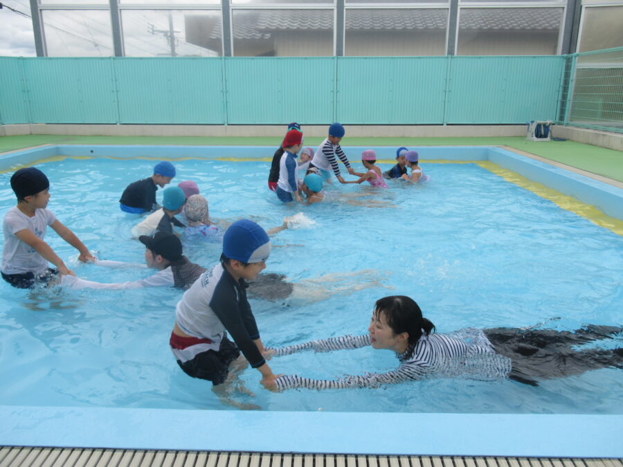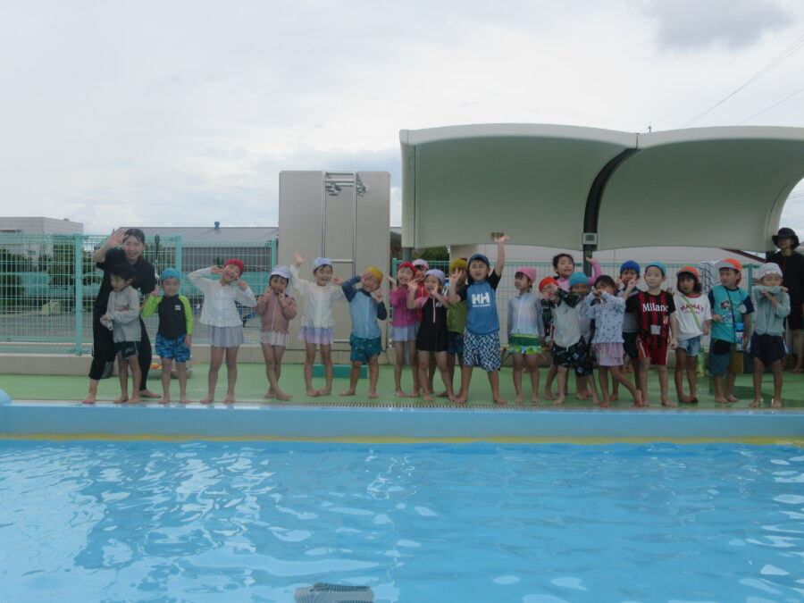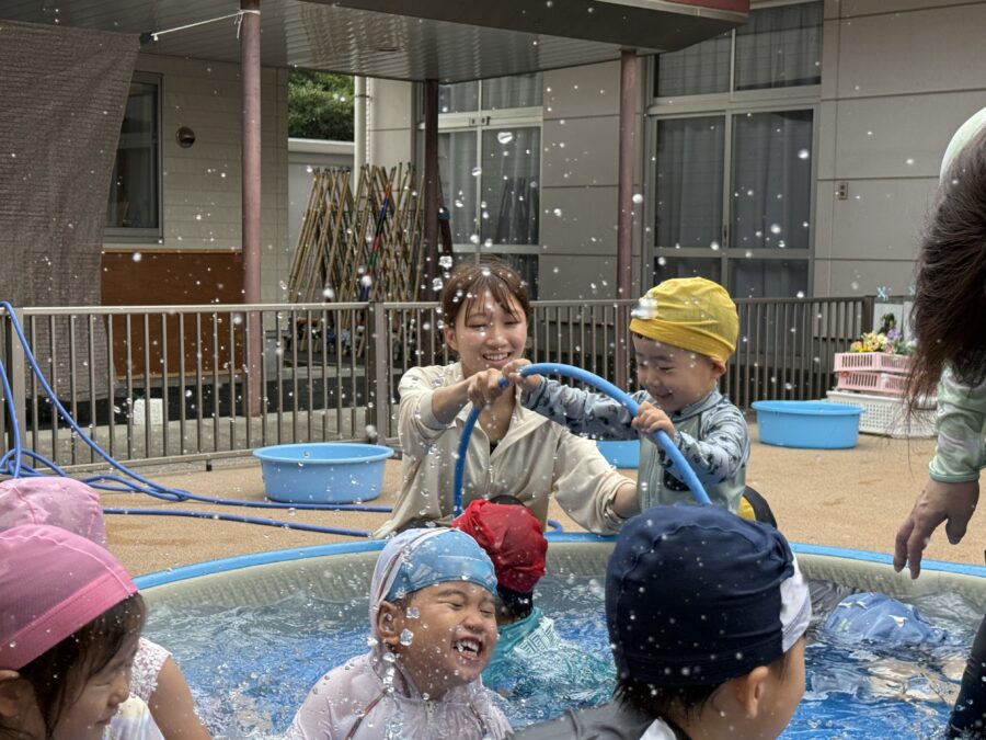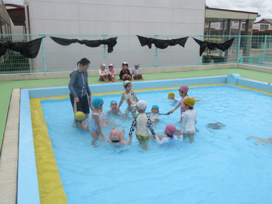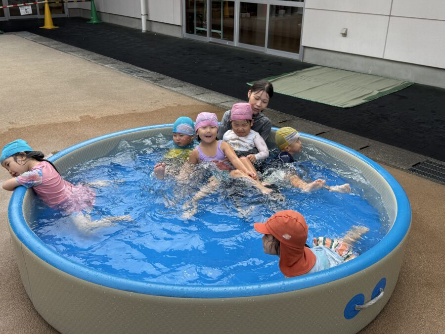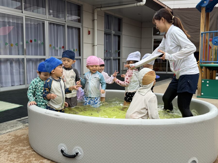 今日は「プール納め」の時間をみんなで楽しく過ごしました。初めは水の冷たさにびっくりする子もいましたが、次第に水に親しんで、水遊びが大好きな様子になりました。トンネルくぐりや「カニさん歩き」で先生とタッチをしたり、先生のお膝に乗ってふかふか浮かんだりと、にこにこ笑顔がたくさん見られました。プール遊びは無事に終了。来年は「もっと大きなプール」で、さらに楽しい時間を過ごせることを楽しみにしています!