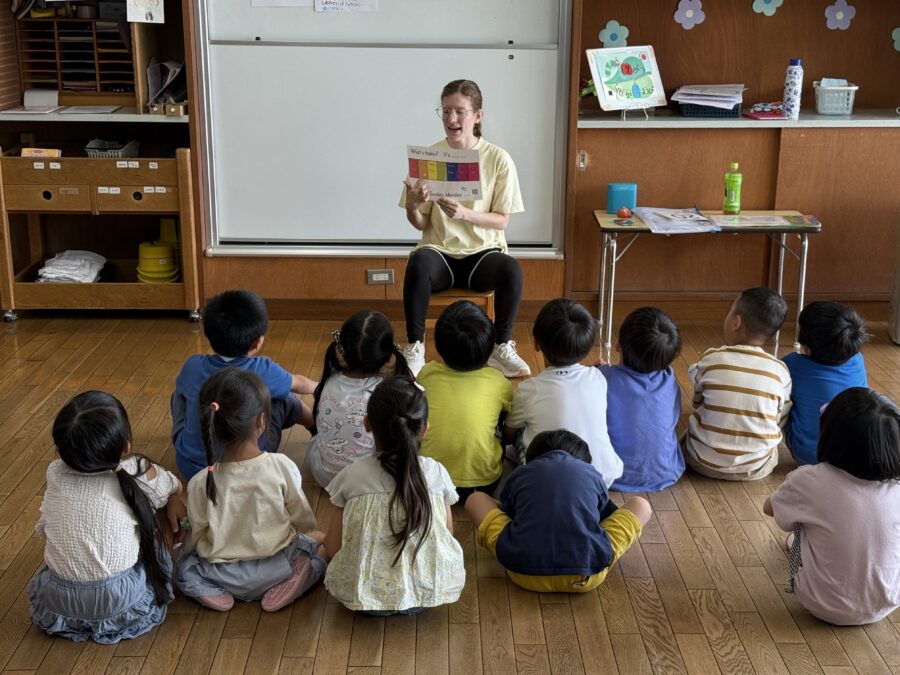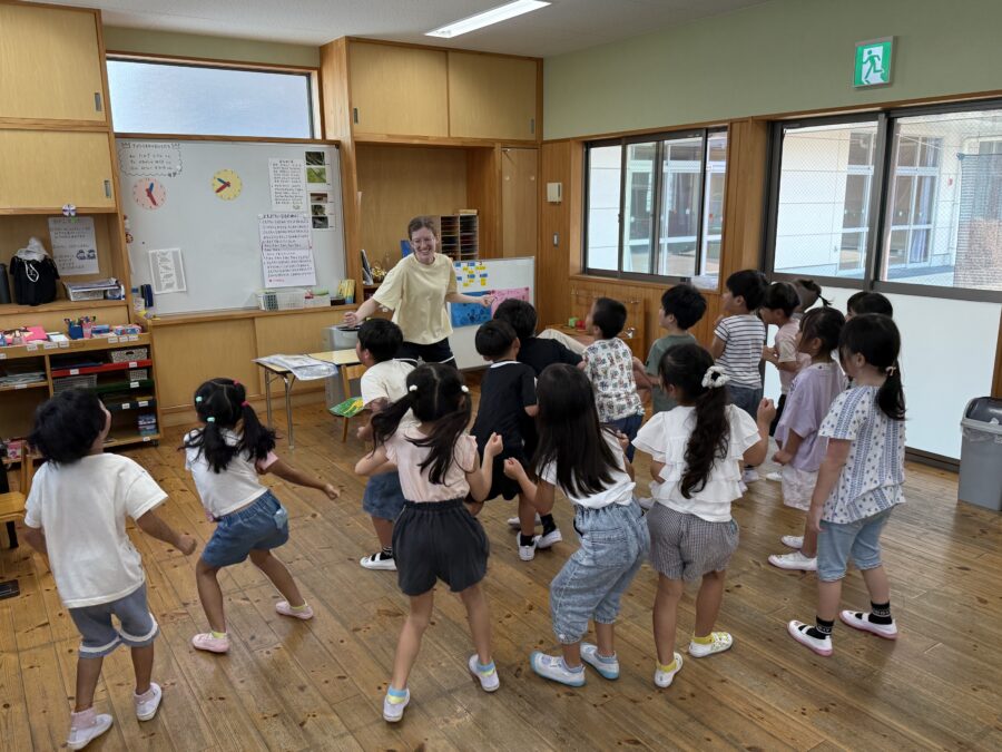 今日は英語あそびの時間は「What’s today?」という問いに対して、曜日のカードを見て「It’s Monday」「It’s Tuesday」などと自信をもって答える姿が見られ、成長を感じました。そのあと「What food do you like?」という質問にも挑戦し、好きな食べ物のカードを選びながら「I like pizza」「I like apples」などと英語で伝えることができました。英語のリズムに乗り、踊ったりもしました。この活動を通じて、こどもたちは「英語で簡単な質問に答えてみよう」「自分の好きなものを言ってみよう」「音楽を聴いて体を動かしてみよう」という意欲が育まれてきています。これからも「言ってみよう」「伝えてみよう」「体で感じよう」という気持ちを大切にしながら、楽しい英語あそびを続けていきたいです。