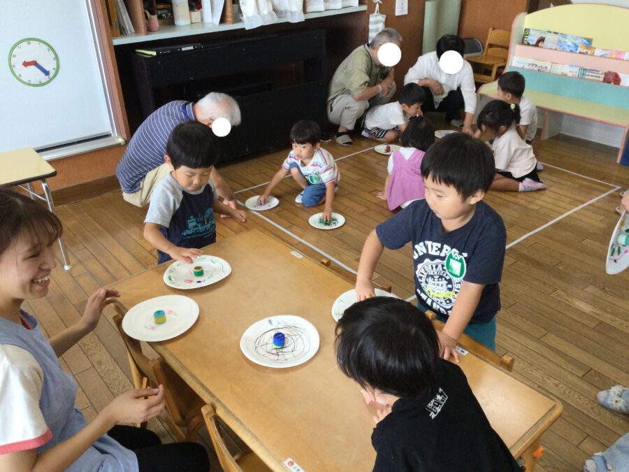 祖父母会を開催しました。遠方からお越しくださったおじいさま・おばあさまも多く、子どもたちにとって特別で温かいひとときとなりました。年少さんは紙皿でこまを作り、おじいさま・おばあさまと一緒に回して楽しみました。年中さんは紙コップでロケットを作り、みんなで「せーの!」と飛ばして大はしゃぎ。年長さんは昔ながらの伝承遊びに挑戦し、おじいさま・おばあさまと一緒に遊びながら「こういう遊びも楽しいね!」と笑顔があふれました。全学年最後にはふれあい遊びの時間をもち、たくさん触れ合うことで、より一層親しみが深まりました。「ぜひ、次は運動会にも遊びにきてね!」とお願いしつつ、みんなで楽しい時間を過ごすことができました。お越しくださった皆さま、本当にありがとうございました。