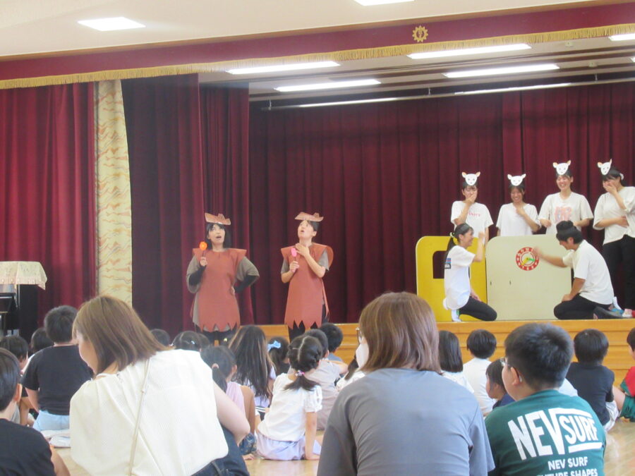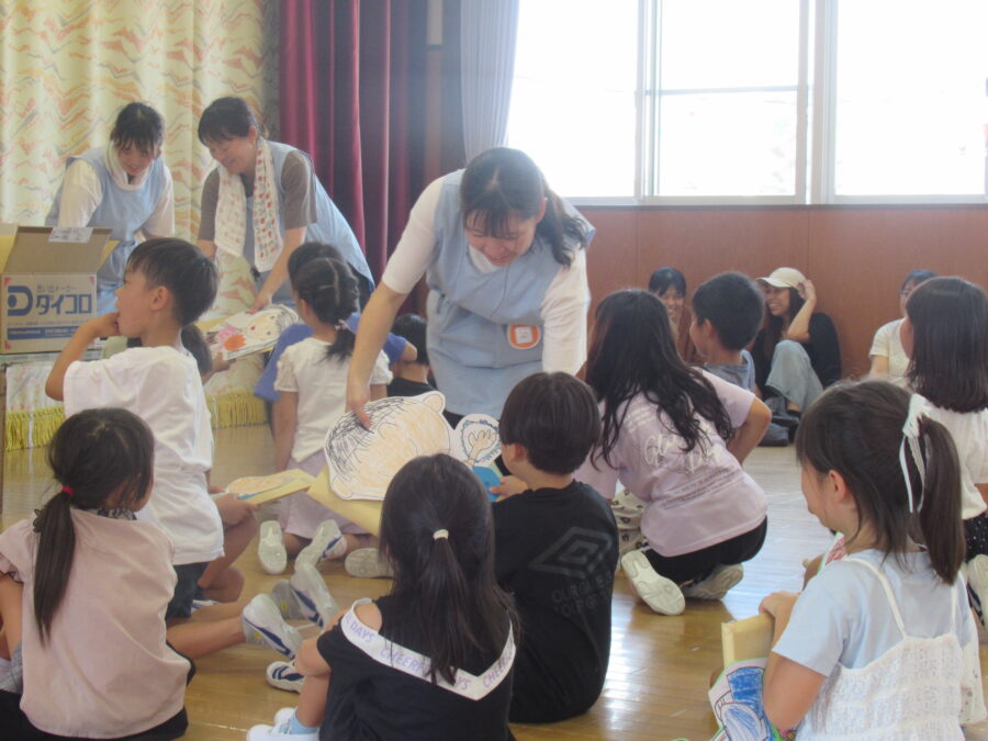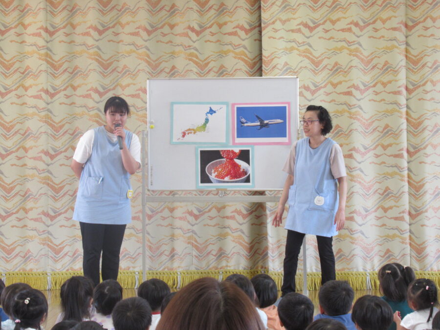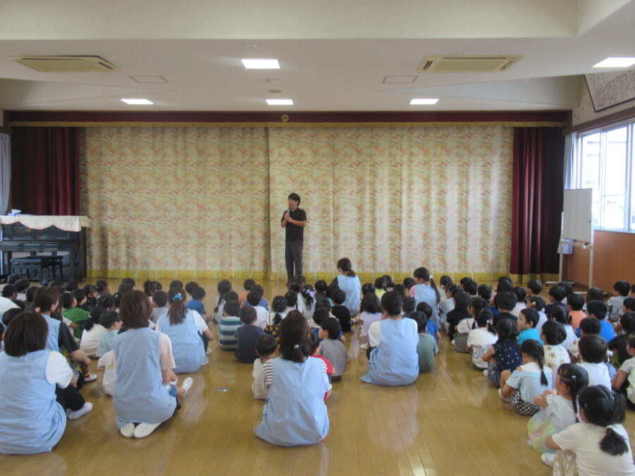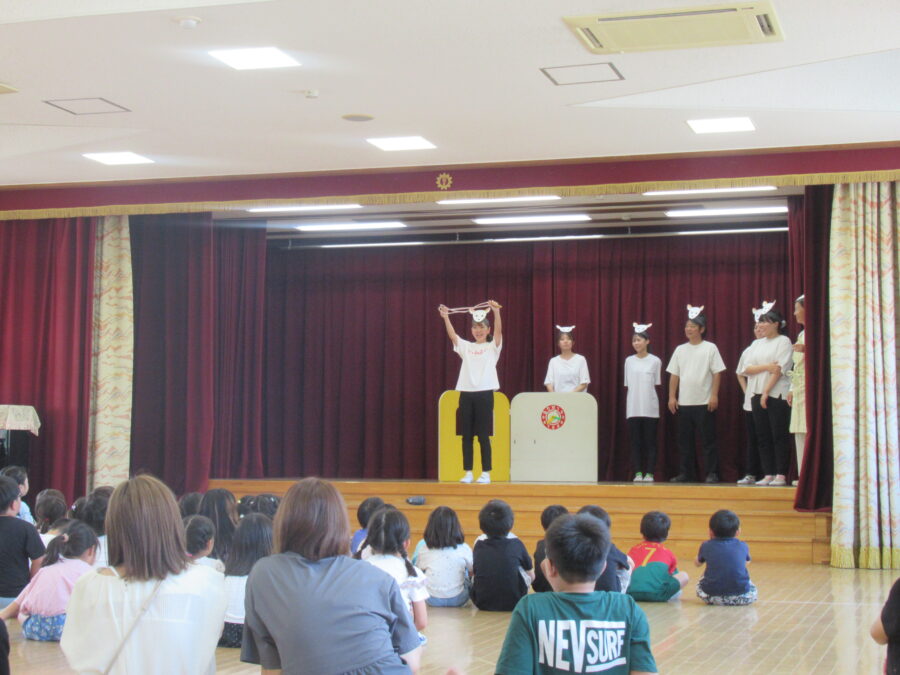 7月の終業式では、子どもたちや職員が遊戯室に集まり、園歌をみんなで歌いました。年少児は振り付け付きで歌い、可愛らしい姿が印象的でした。その後、1学期の楽しかった遊びや行事を振り返りながら、夏休みのお約束を確認しました。子どもたちは、楽しい思い出を話し合いながら、夏休みに向けての意気込みを新たにしていました。また、夏休みを機に転園するお友だちの紹介があり、みんなで「元気でね」と温かく送り出しました。職員からは、安全で楽しい夏休みを過ごすための劇を通じて、「知らない人についていってはダメよ」と呼びかけ、楽しい夏休みを過ごしてほしいという願いを伝えました。