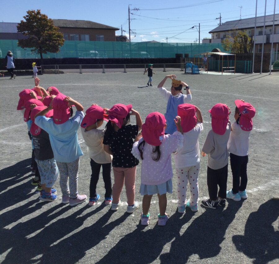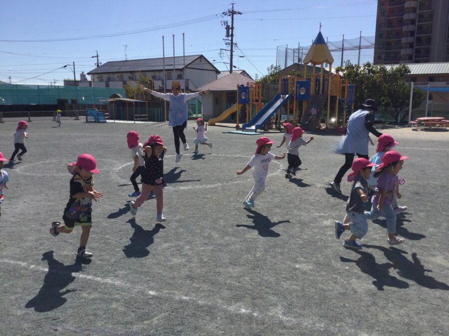 ぱんだぐみとりすぐみが園庭で「むっくりくまさん」をしました。みんなで「むっくりくまさん むっくりくまさん あなのなか・・・」と歌いながら、くまさんを起こさないようにそっと輪になって回ります。くまさんが目を覚ますと追いかけられるので、子どもたちは必死に逃げて、大きな声で「キャー!」と楽しそうでした。スリルがあって大好きな遊びです。