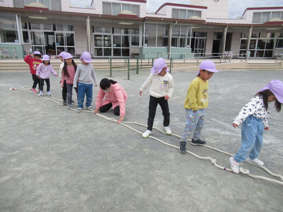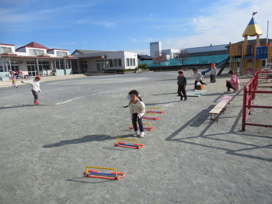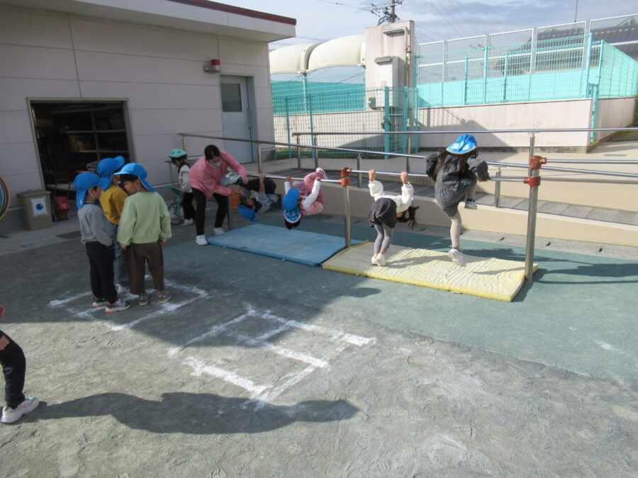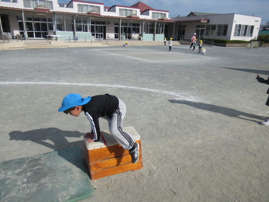 年長児が戸外でサーキット遊びを楽しみました。園庭にいくつかの運動ポイントを用意し、子どもたちは綱渡りや跳び箱、両足跳び、鉄棒などに挑戦しました。戸外で体を思いきり動かしながら、何度も繰り返し挑戦する中で、できた!という喜びや挑戦する気持ちを味わう姿が見られました。友だちとお互いに励まし合う様子からは、仲間と一緒に体を動かす楽しさも感じられました。サーキットを通して、バランス感覚や全身の力を使う運動能力が育まれ、身体を動かす楽しさにも気付くことができたようです。