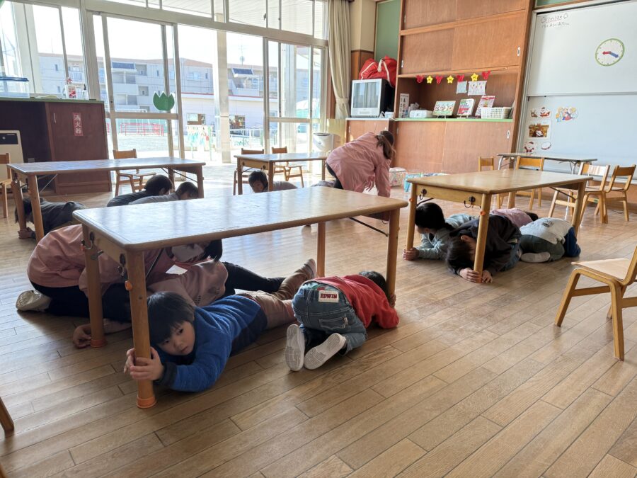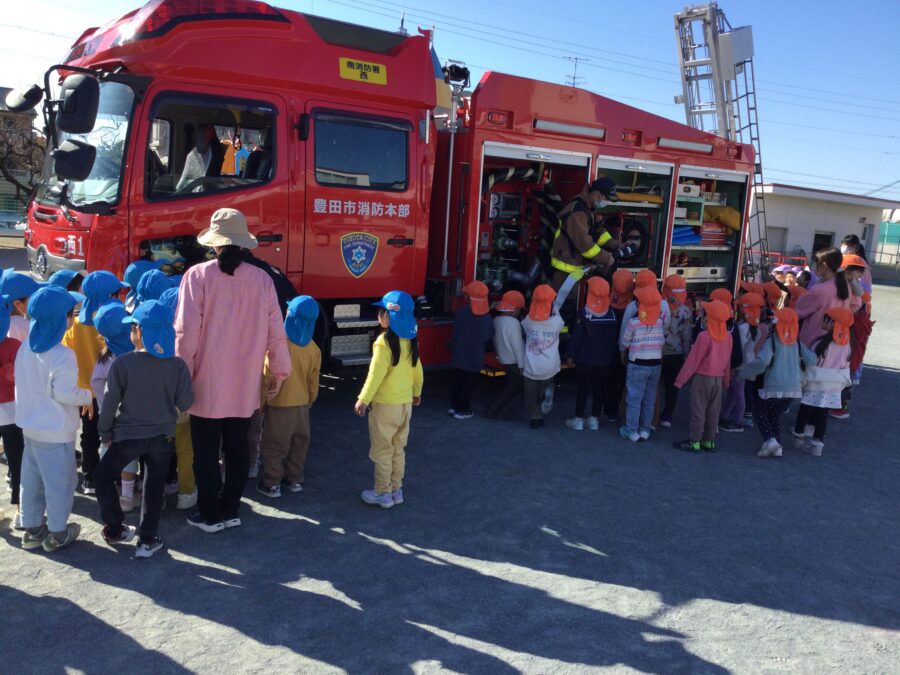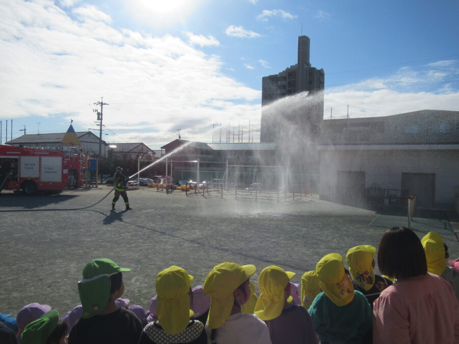 豊田市消防本部西分署の消防士さんと消防車が幼稚園に来てくれました。まず最初に、みんなで避難訓練を行いました。地震の揺れを想定し、机にもぐったり、サイレンの音を聞いて、先生と一緒に安全な場所へ静かに移動する練習をしました。子どもたちは真剣な表情で取り組んでいました。その後は、消防士さんが放水の様子を見せてくださいました!大きなホースから勢いよく出る水に、子どもたちは目をキラキラさせて見入っていました。消防車のまわりでは、「これは何?」「いつ使うの?」と、部品や道具についてたくさん質問が出ました。消防士さんは一つひとつ丁寧に答えてくださり、子どもたちも大満足の時間になりました。