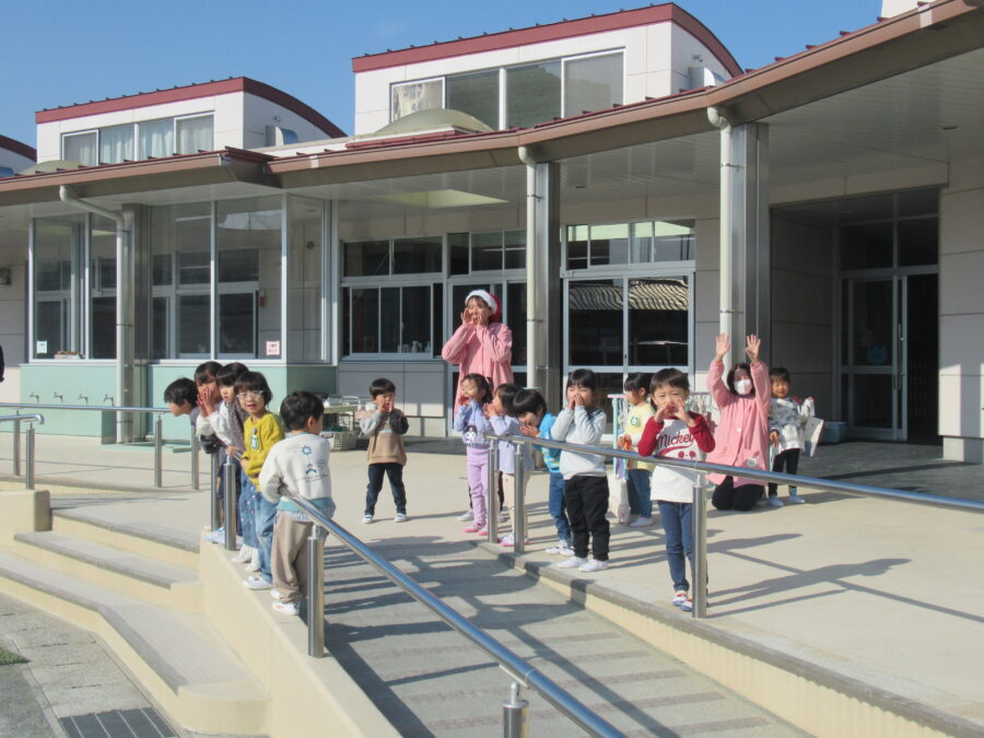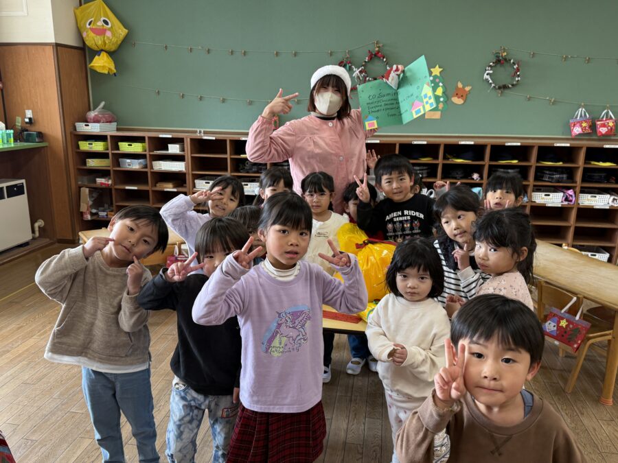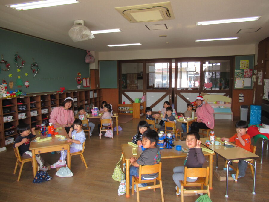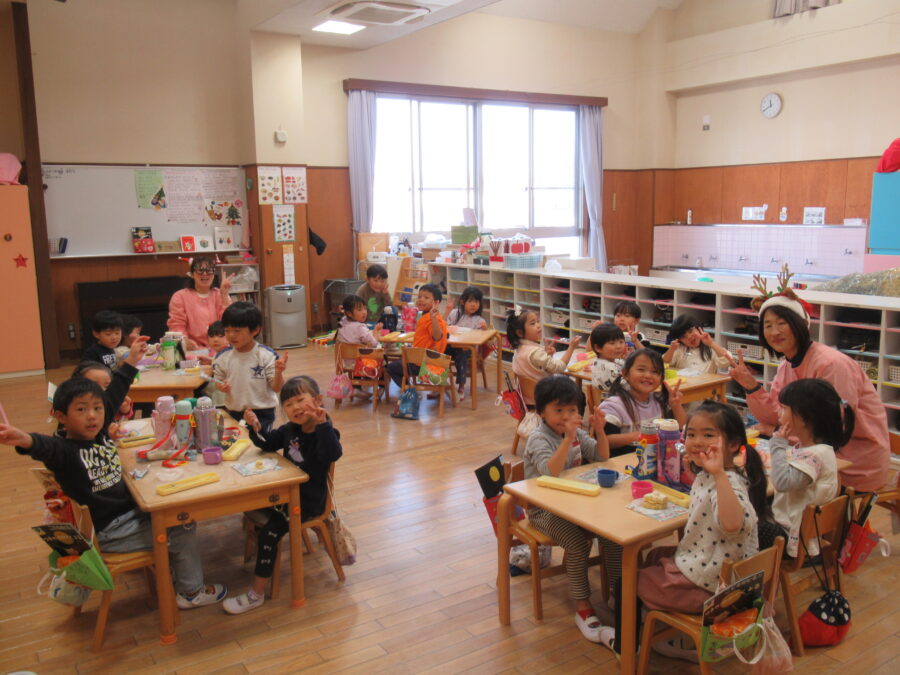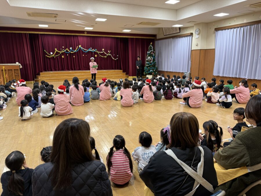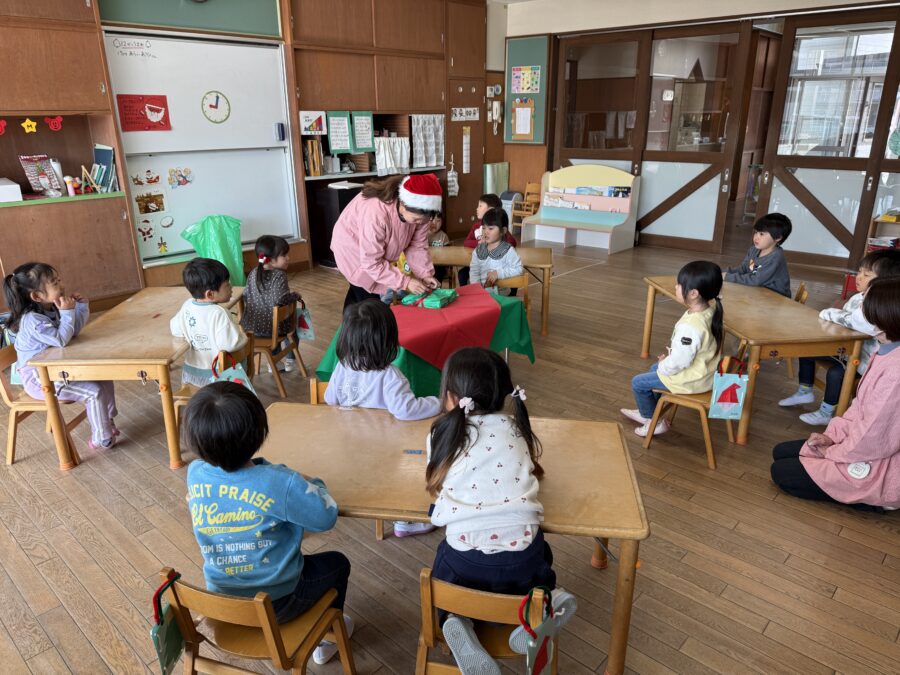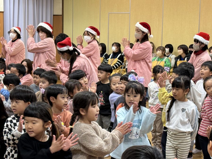 クリスマスケーキを食べ、にこにこ笑顔になりました。クリスマス会の後も、時々「リンリンリン♪」という鈴の音が聞こえるたびに、園庭へ飛び出してサンタさん探しをする子どもたちの姿がとても可愛らしかったです。ひまわり会の皆さま、ご参加ありがとうございました!子どもたちにとって心に残る素敵なクリスマスの一日になりました。