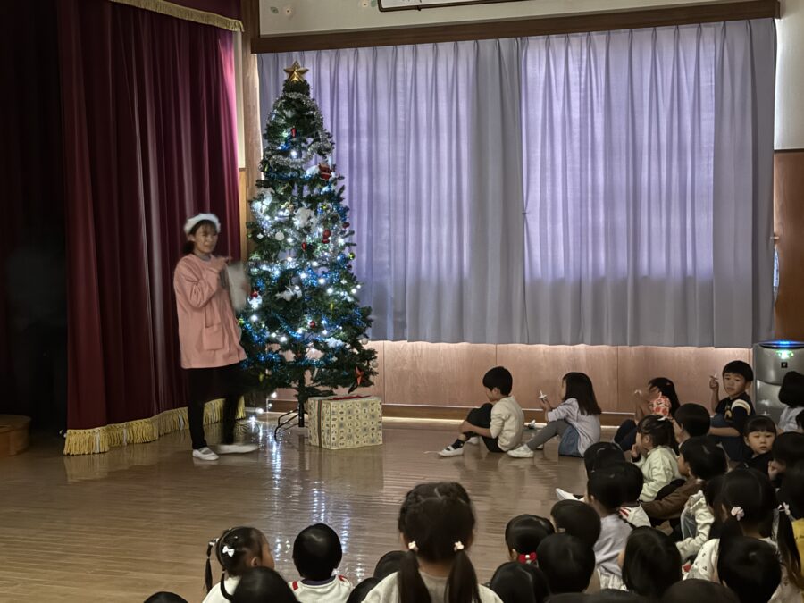 登園時から、園内にはクリスマスソングが流れ、子どもたちは音楽に合わせて先生と一緒に踊ったり、口ずさんだりしてワクワク感いっぱいの一日が始まりました。お楽しみ会では、まず真っ暗な部屋でのクリスマスツリー点灯がありました。ピカピカと光るイルミネーションを見て、子どもたちの目もキラキラ。皆からは思わず「わーきれい!」の声が上がりました!