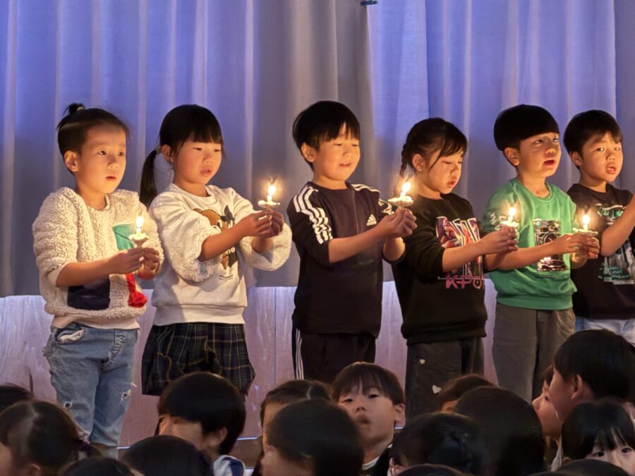 そして、年長さんによるキャンドルサービス。「きよしこの夜」が静かに流れる中、女神さんから年長の先生へ「願いが叶う火」が灯され、そこからひとりひとりに火が手渡されました。小さな火がゆらゆら揺れ、とても美しく、なんだか心もすっきり綺麗になったような時間でした。