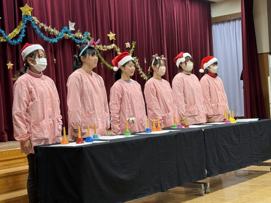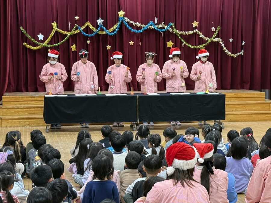 その後は、先生たちによるハンドベル演奏を鑑賞。柔らかく澄んだベルの音色に、子どもたちもうっとり聞き入っていました。最後は、みんなで「あわてんぼうのサンタクロース」を歌いながら踊りました。振り付けもバッチリ、にこにこ笑顔で楽しく踊る姿がとても印象的でした。
