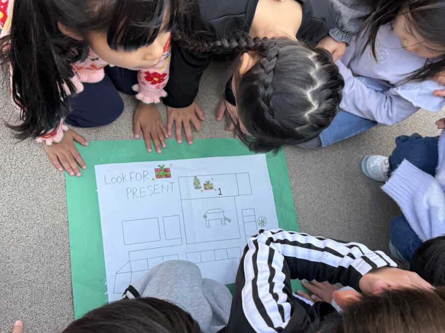 お楽しみ会が終わると、どこからともなく「リンリンリン♪」という鈴の音が・・・!子どもたちは大慌てでサンタさんを探しに出発!年少さんはお部屋に戻ると、サンタさんからの手紙とプレゼント、そしてクリスマスケーキが届いていて大喜び!年中さんはサンタさんのお手紙に書かれたヒントを頼りに、プレゼントの隠し場所をみんなで探しました。プレゼントを見つけた瞬間の「やったー!」という歓声が響いていました。年長さんは地図を手に、クラスのみんなで協力して宝探し!他クラスの地図と見比べながら考える姿もあり、チームワークを感じる場面でした。見つけたプレゼントを大事そうに抱えてお部屋に帰る姿がとても微笑ましかったです。