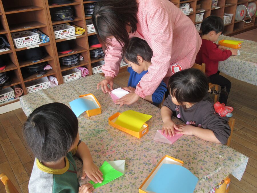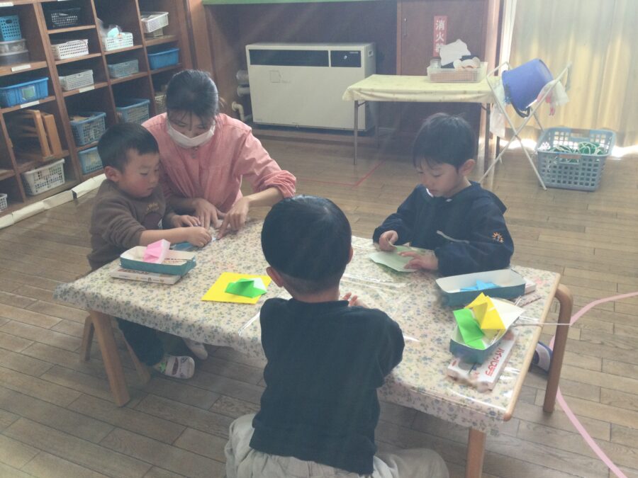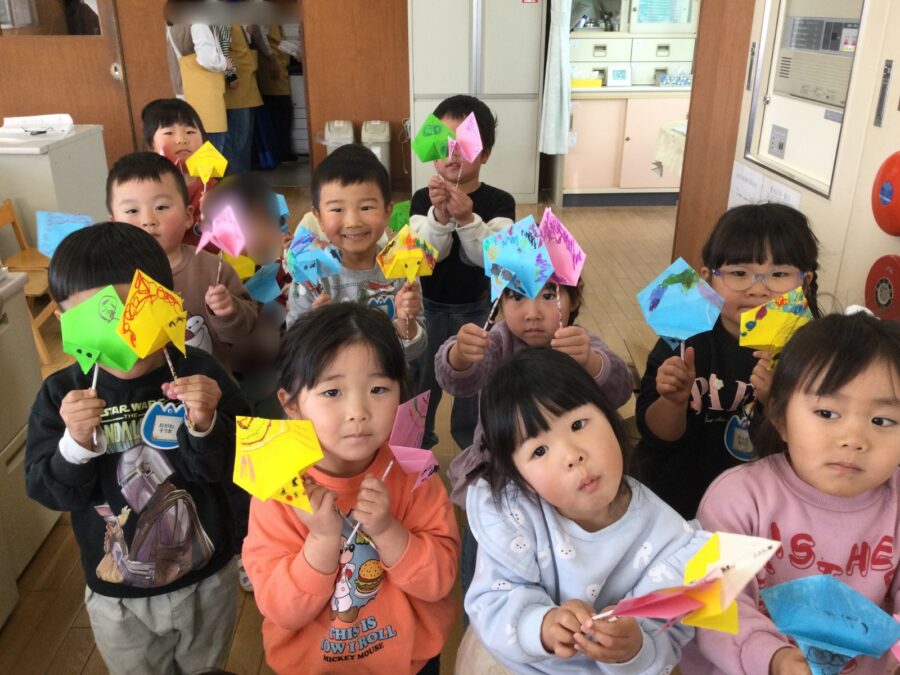 年少さんが折り紙でくじゃくを折りました。みんなは「アイスクリーム折り」が上手にできるようになり、その折り方をアレンジしてくじゃくを作りました。少し難しいところは先生と一緒に折って、丁寧に仕上げることができましたよ。クレパスで顔を描いて出来上がり!出来上がったくじゃくを持ってお散歩へレッツゴー!出会う先生やお友だちに見せて大喜びでした。