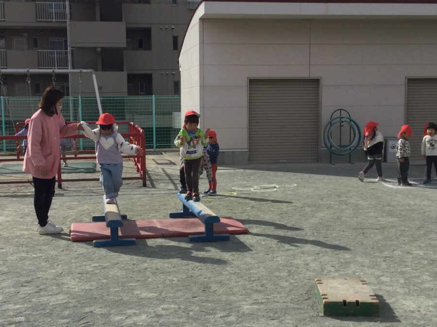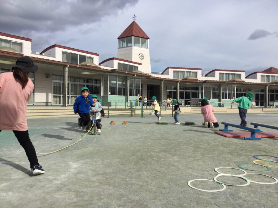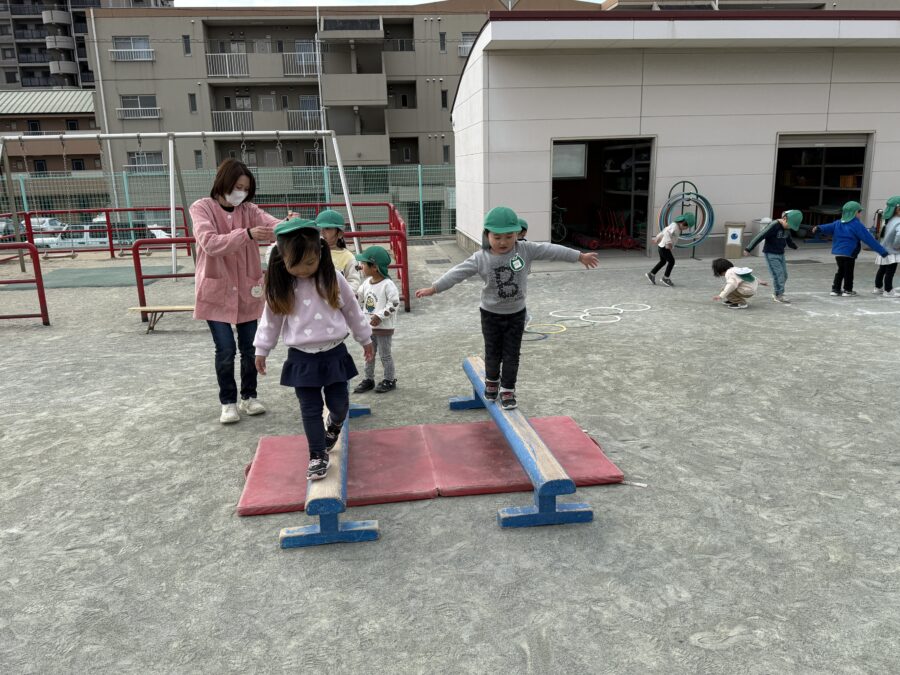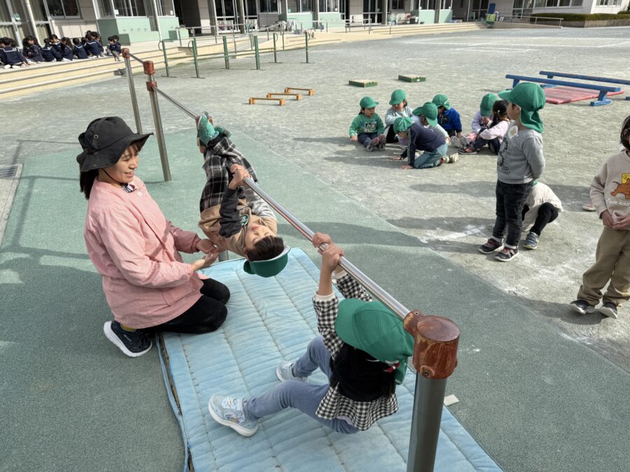 年少児のうさぎぐみとこあらぐみが園庭でサーキットをしました。鉄棒では、「ブタの丸焼き」が上手にできるようになり、手と足を使って体をしっかり支えられるようになりました。長縄跳びでは、先生が回してくれる縄に合わせてリズムよくジャンプし、跳べる回数も少しずつ増えてきています。平均台では、交互に足を出して前に進めるようになりました。できることがたくさん増えた日になりました!みんなのがんばる姿は、とてもかっこよかったです。
