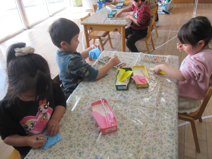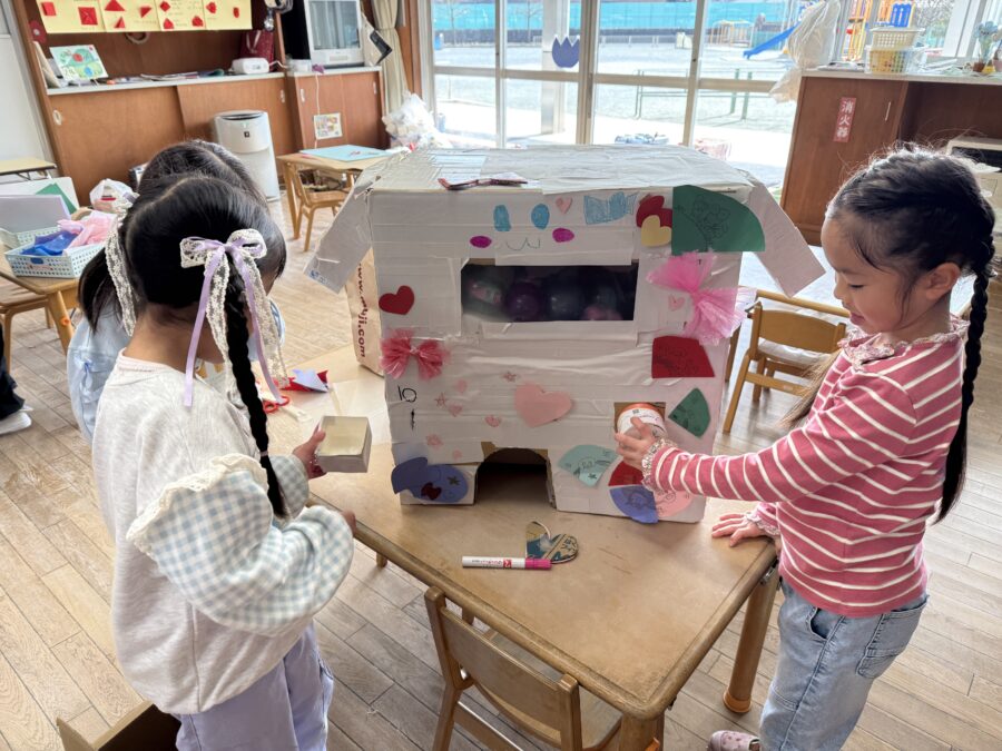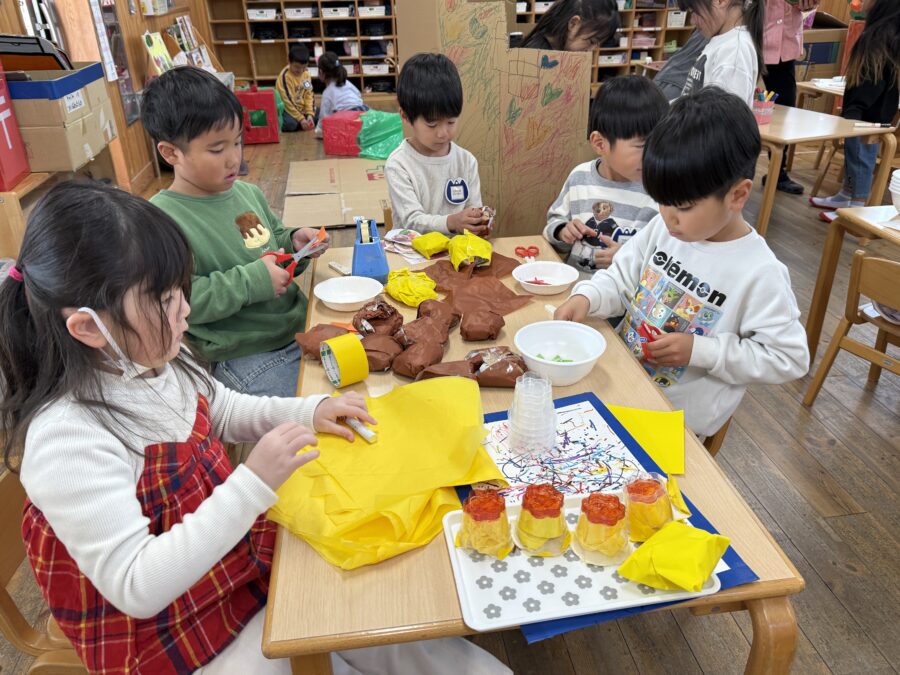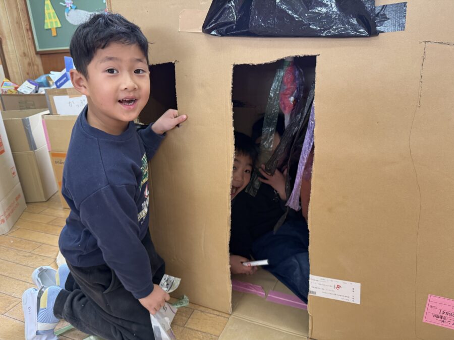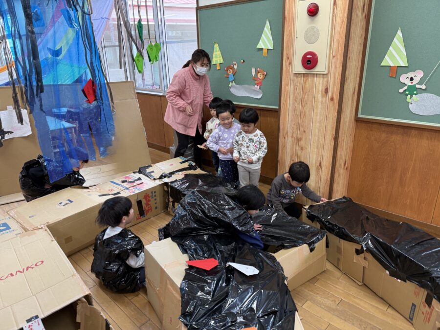 美山ランドを成功させよう!年長さんが、段ボールや廃材を使って共同製作に挑戦しました。友だちとグループになり、「どんな物を作ろう?」と自分の意見を出し合いながらアイデアを考えました。段ボールを切ったり貼ったり、廃材を工夫して組み合わせたりしながら、みんな夢中で製作に取り組んでいました。「考える楽しさ」と「みんなで作る楽しさ」がいっぱい詰まった素敵な時間になりました。