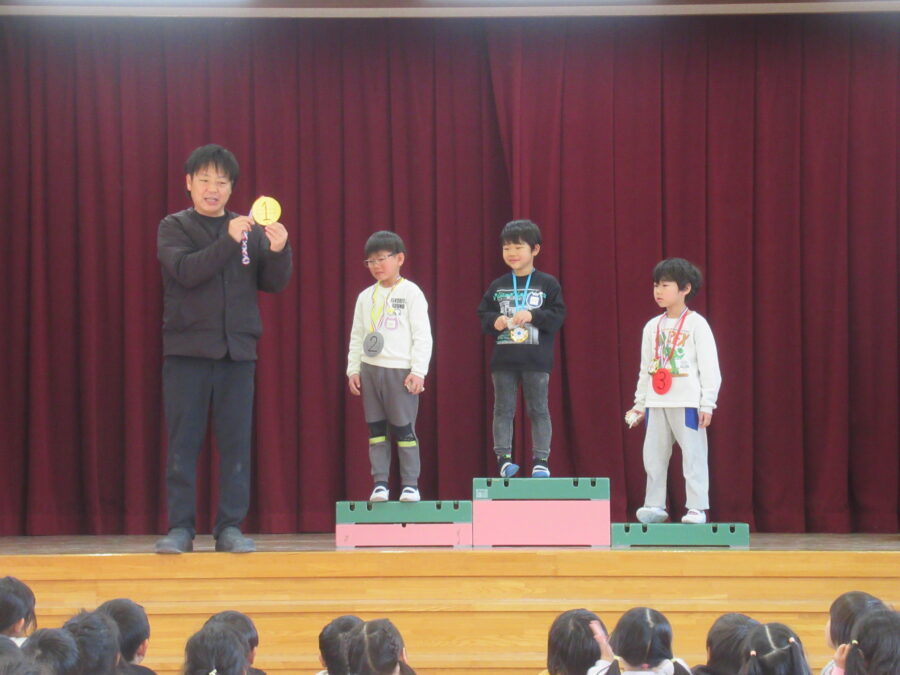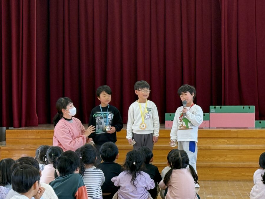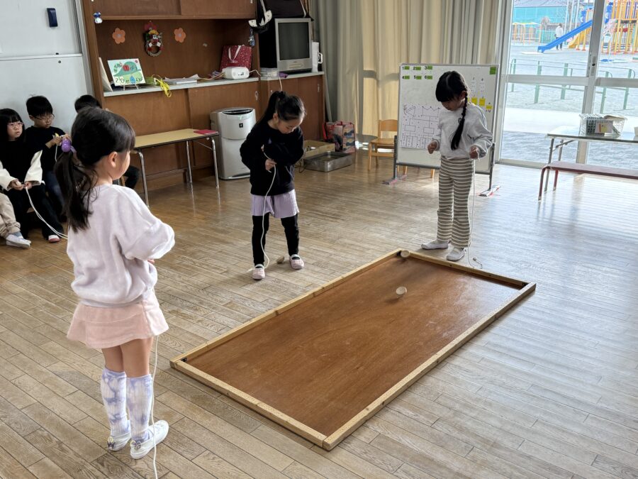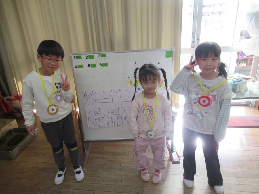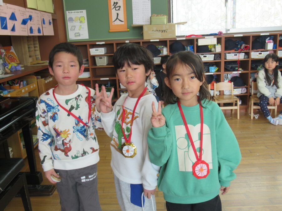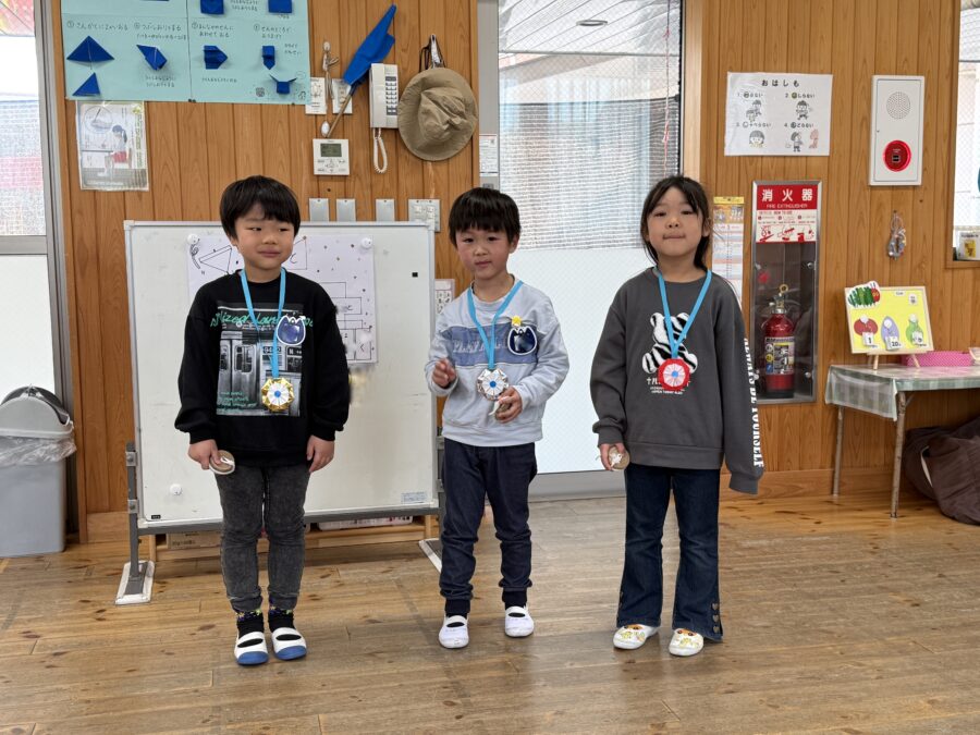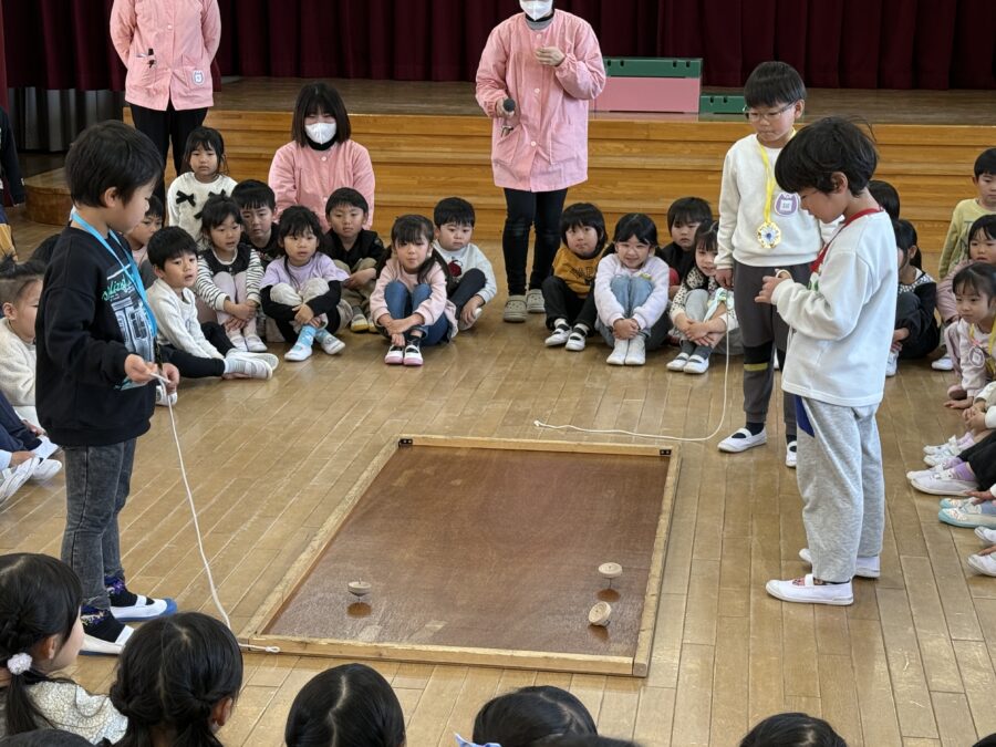午後の本大会では、全園児がワクワクしながら応援する中、クラス代表に選ばれた子どもたちが集まり、笑顔いっぱいの対戦を見せてくれました。どの子も自分の力を精一杯出し切り、順位が決まる瞬間には温かい拍手が響きました。結果は1位・2位・3位が決定し、がんばったみんなに大きな拍手を送りました。子どもたちは技を競う楽しさだけでなく、挑戦する気持ちや友だちとの応援の大切さも体験しました。