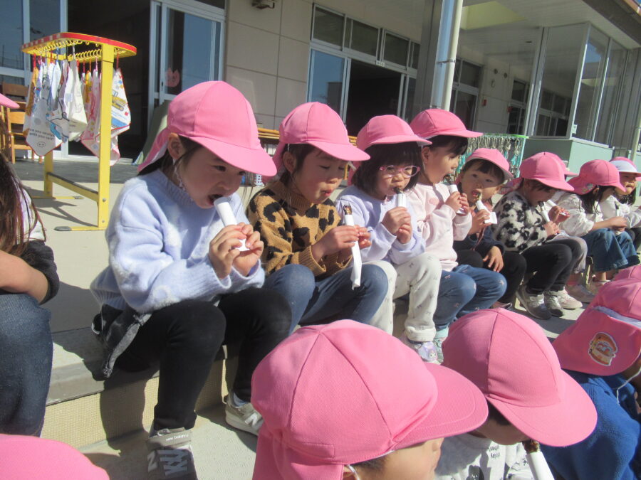 今日はみんなで豆まきをしました。自分たちで製作した“ます”に豆を入れ、鬼退治の準備はばっちり!「豆を投げるぞ!」とやる気満々の子どもたちでした。ところが、いざ鬼が登場するとびっくりして涙する姿も・・・。それでも勇気を出して豆を投げる姿はとても頼もしく、きっと子どもたち一人ひとりの“心の鬼”も追い払うことができたことでしょう。豆まきのあとは、イワシをいただきました。「おいしい!」と嬉しそうに食べる様子も見られ、季節の行事をみんなで楽しむことができました。