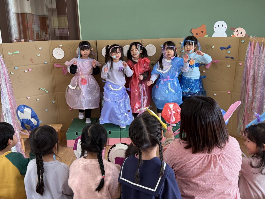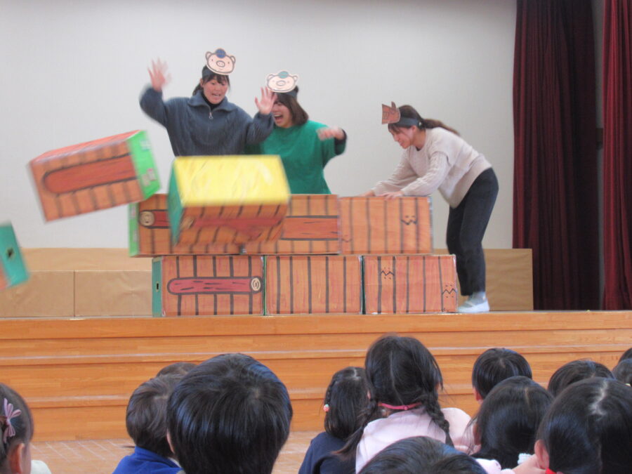 そして今月からは、年少児も一緒に先生たちの出し物「さんびきのこぶた」を観ました。