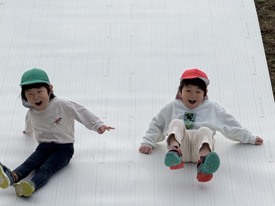年少さんが、深田公園へ芝すべりに行きました。公園に着くと、「長い滑り台だ!」と目を輝かせる子どもたち。芝の斜面を勢いよくすべると、「もう一回!」と大喜びでした。何度も何度も土手を駆け登り、すべっては登りを繰り返し、元気いっぱい楽しむ姿が見られました。青空の下、広場では体をたくさん動かし、笑顔あふれる一日となりました。
