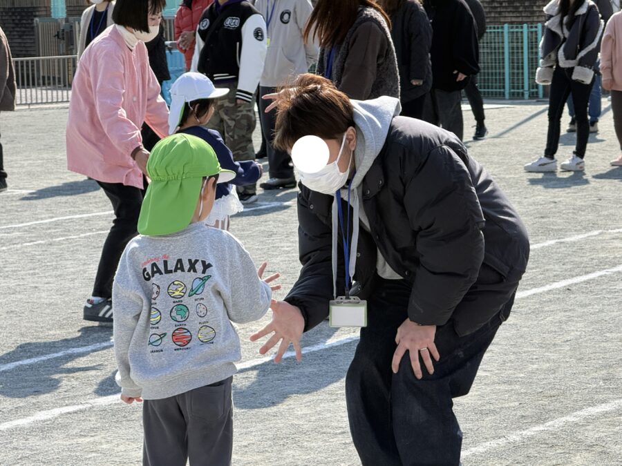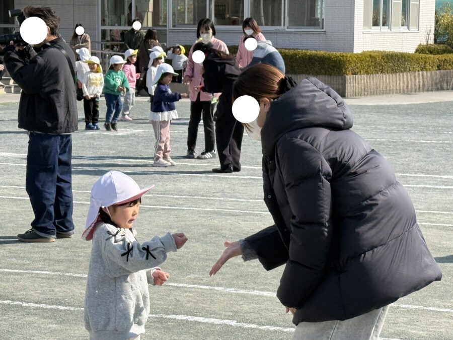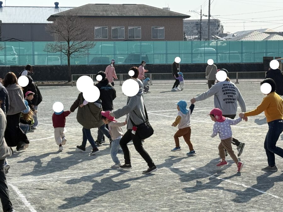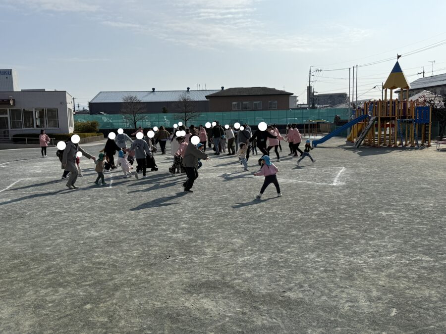 年少児の思い出会を行いました。朝の自由遊びから参加していただき、普段の園での様子を見ていただきました。「これはこうして遊ぶんだよ」「ここが楽しいよ!」と、お家の方に嬉しそうに教える姿がとても印象的でした。日頃の遊びに自信をもって取り組んでいる様子が感じられました。その後は、親子で「〇△□」のゲームをして遊びました。形をしっかり理解しながら、鬼に捕まらないよう一生懸命逃げる子どもたち。楽しそうな笑い声と、かわいらしい姿がたくさん見られました。親子でふれあい、笑顔あふれる素敵な思い出会となりました。