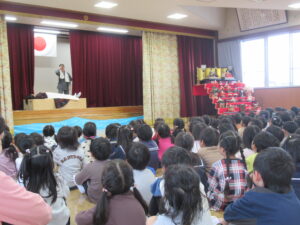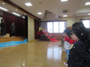 ひなまつりにまつわるクイズと職員劇「おはなとたろう」を観てひなまつりの由来や意味をみんなで学びました。最後には大きな声で「うれしいひなまつり」を歌いました。