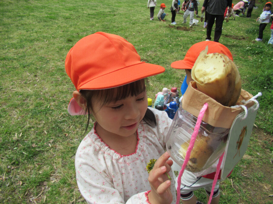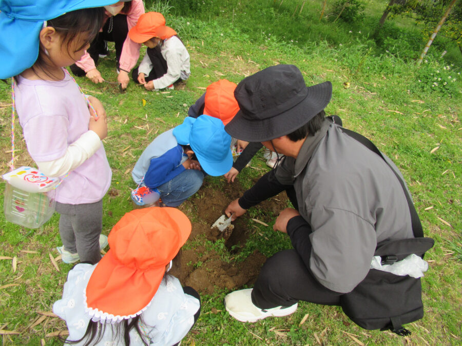 お友だちと力を合わせたり、先生の力をかりてたくさんのタケノコを収穫していました。また、タケノコ以外にも昆虫や草花などさまざまな春をみつけることができ、発見とお土産いっぱいのお散歩となりました。