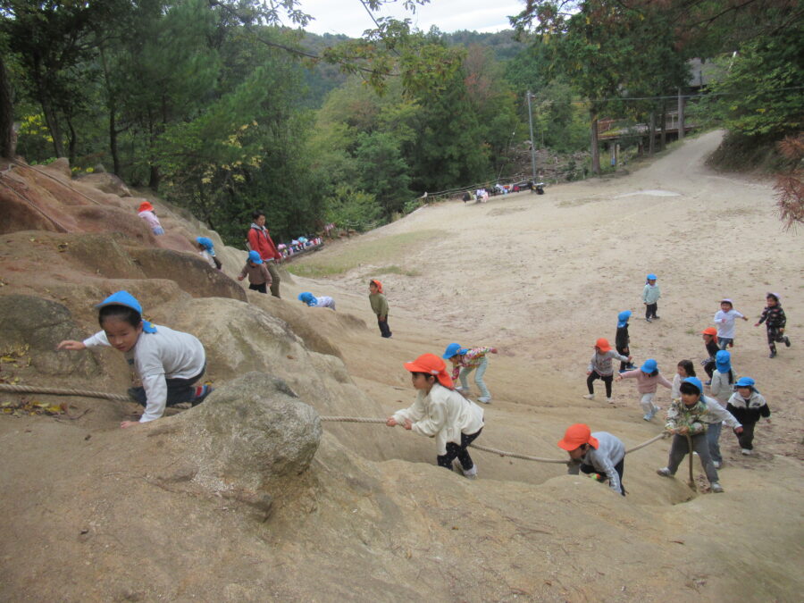 山の中では、迷路遊びにチャレンジ。「こっちは行き止まりだよ」「こっちは大丈夫、こっち進もう」と子どもたち同士で声を掛け合いながら、協力して迷路のゴールを目指した姿が印象的でした。また、暗闇トンネルにも挑戦。入り口は真っ暗で先が見えない不安もあったものの、「入ってみよう」と笑顔で勇気を出す子も多く、途中で怖くて涙する子もいましたが、全員が無事にトンネルをくぐり抜けることができました。さらに、崖登りではロープを使って上を目指し、「あと少し」「頑張れ」と声を掛けながら互いに励まし合って登る子どもたちの姿がありました。六所山での体験は子どもたちにとって、自然の中での冒険だけでなく、勇気・協力・成長を実感する貴重な一日となりました。