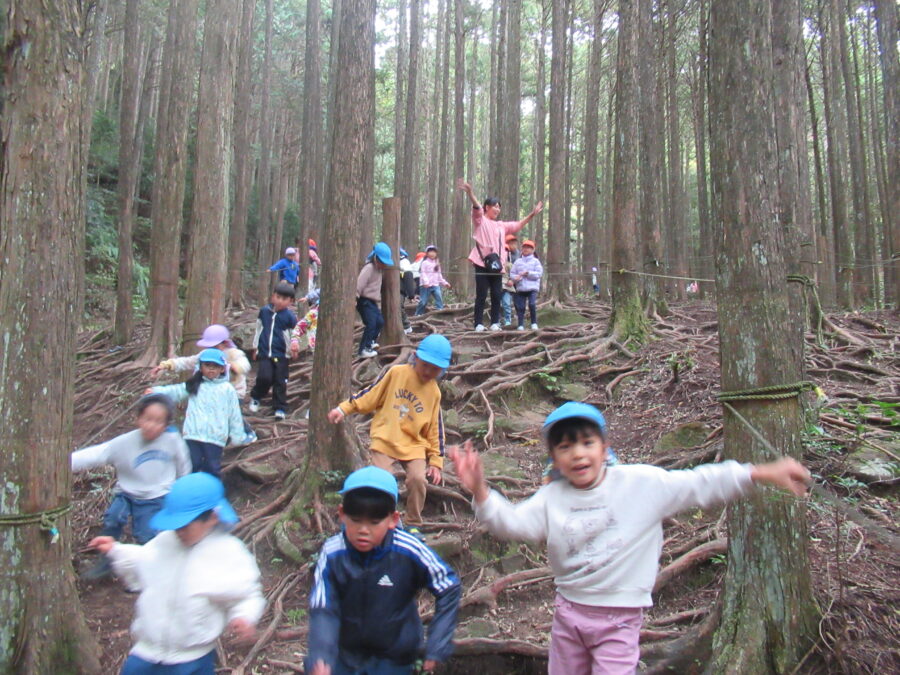 山の中では、迷路遊びにチャレンジ。「こっちは行き止まりだよ」「こっちは大丈夫、こっち進もう」と子どもたち同士で声を掛け合いながら、協力して迷路のゴールを目指した姿が印象的でした。また、暗闇トンネルにも挑戦。入り口は真っ暗で先が見えない不安もあったものの、「入ってみよう」と笑顔で勇気を出す子も多く、途中で怖くて涙する子もいましたが、全員が無事にトンネルをくぐり抜けることができました。さらに、崖登りではロープを使って上を目指し、「あと少し」「頑張れ」と声を掛けながら互いに励まし合って登る子どもたちの姿がありました。六所山での体験は子どもたちにとって、自然の中での冒険だけでなく、勇気・協力・成長を実感する貴重な一日となりました。